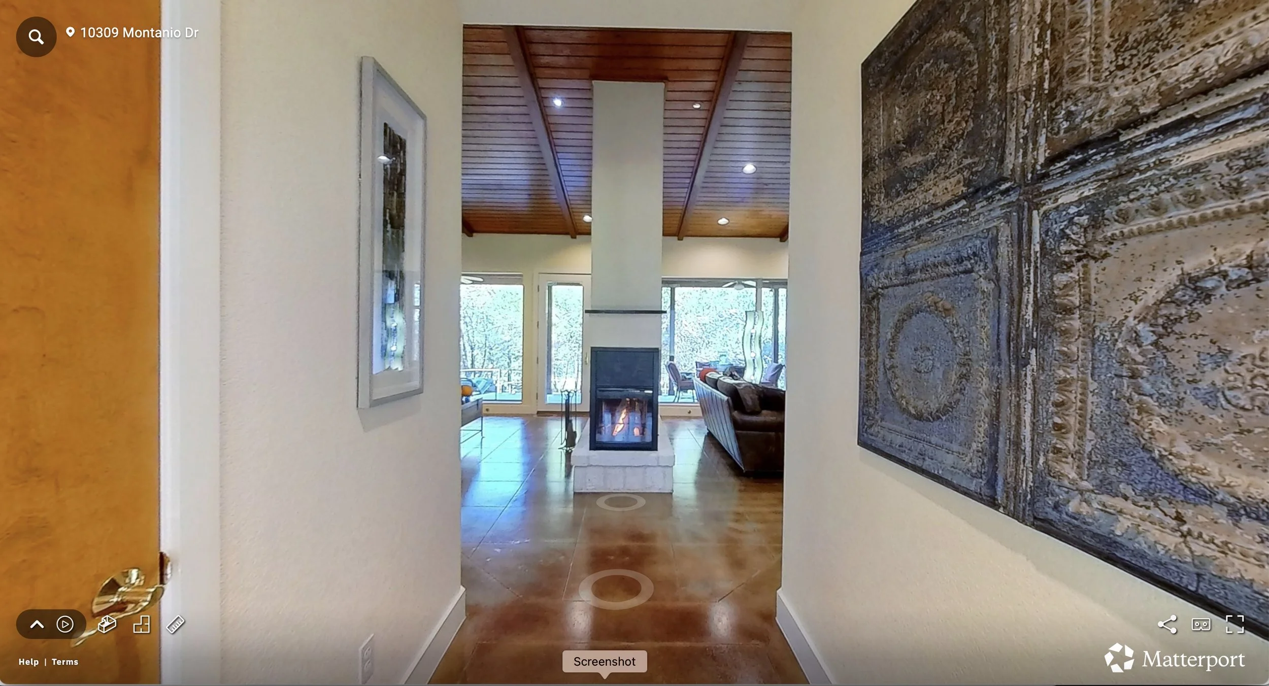 The centerpiece of this extraordinary home is its vast living area, with a wall of floor-to-ceiling windows providing a spectacular view of the property’s forest and wildlife. A unique three-dimensional stucco woodburning fireplace adds warm charm to the open living space.